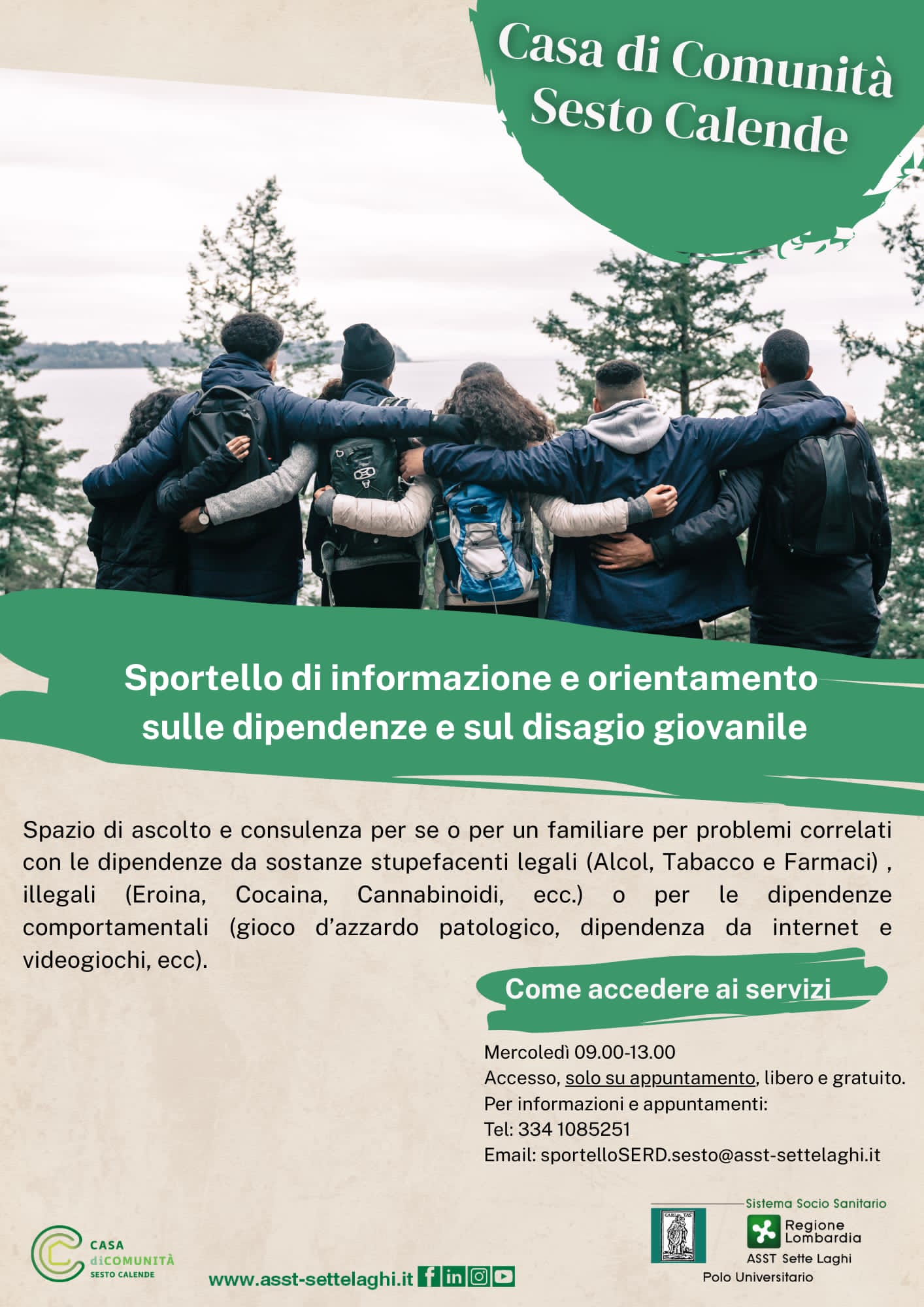 Allegato alla presente la locandina inerente la “Casa di Comunità” di Sesto Calende che svolge un’attività di sportello inerente l’informazione ed l’orientamento sulle dipendenze e sul disagio giovanile.
