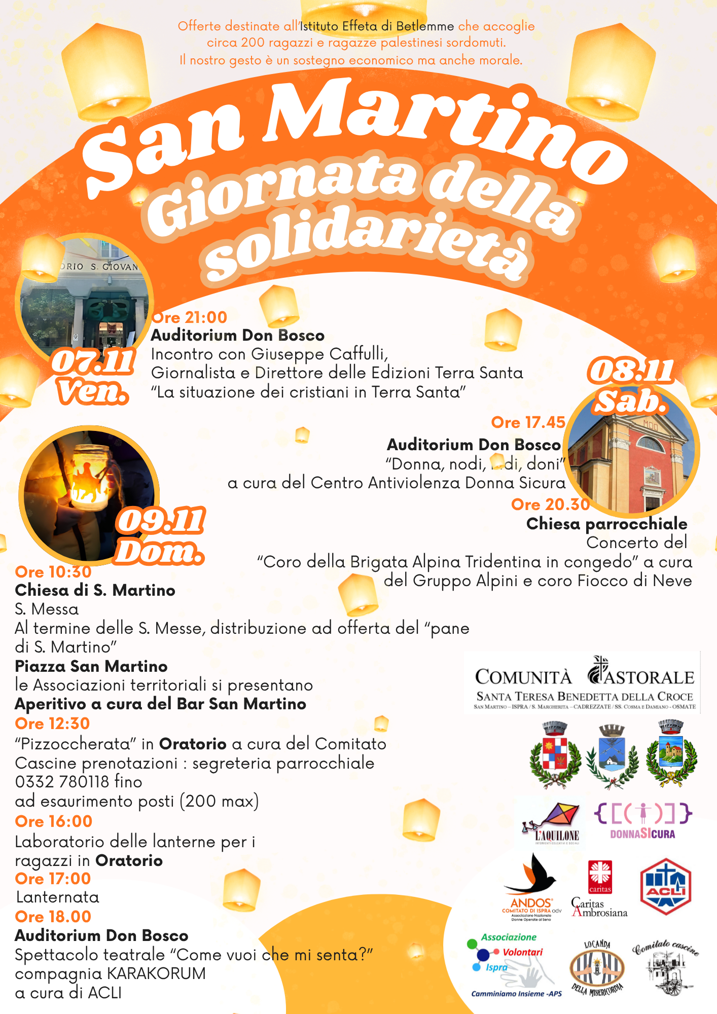 L’Associazione A.V.I. Camminiamo Insieme APS di Ispra, con la collaborazione delle Associazioni Andos- Ispra, Acli Ispra, Caritas, L’Aquilone, Locanda della Misericordia, della Parrocchia San Martino Vescovo di Ispra e con il patrocinio del Comune di Ispra, organizza l’evento “Giornata della Solidarietà” .